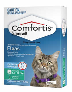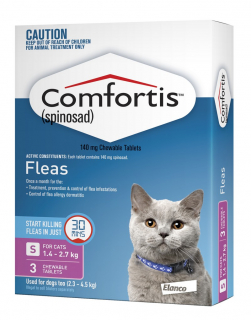 Comfortis is chewable, beef-flavoured tablet that kills fleas and prevents flea infestations on dogs and cats for a full month. Comfortis is: