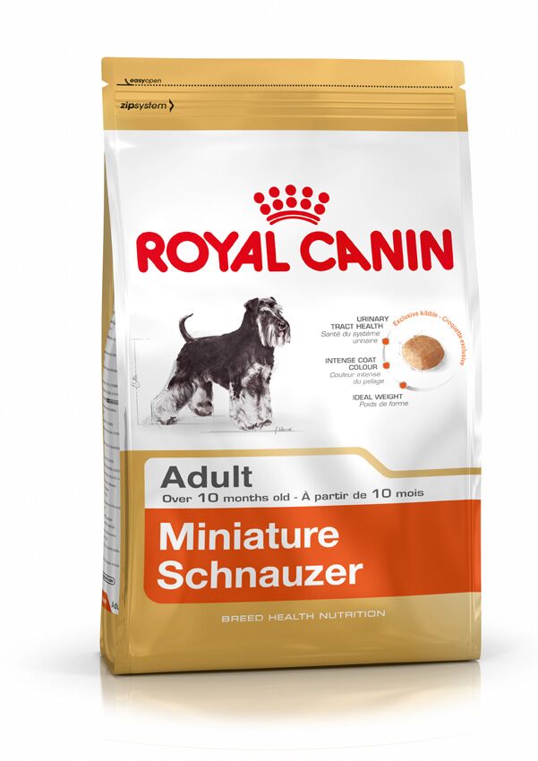 This formula contains optimal levels of specific amino acids to help maintain the coat’s natural colour. This formula helps maintain the Miniature Schnauzer’s ideal weight. This formula helps reduce tartar formation thanks to calcium chelators.